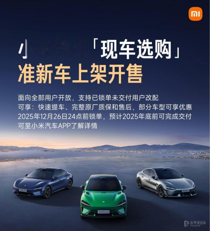 12月12日,小米汽车宣布在“现车选购”新增准新车源并开放销售。这是小米汽车首次向市场投放包含“准新车”在内的多类现车资源。即日起,用户可通过小米汽车APP直接选购全新现车、官方展车和准新车三类车辆。所有用户均可访问该平台,已锁单但未交付的用户也可选择改配现车。
